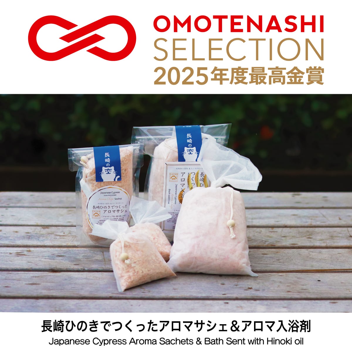 おがくず状に加工した長崎県産ひのきを主原料とし、細かく砕いたひのきのウッドチップやヒノキチオールと組み合わせ不織布に詰めた天然アロマ商品です。